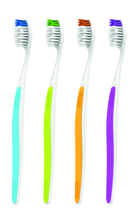 Toothbrush with an ergonomically designed contoured handle made with non-latex elastomer non-slip grip material. Angled head with Tynex soft filament. Smooth end rounding for extra-soft feel. Compact head with angled handle makes it easier to clean all areas of the mouth. Assorted colours.