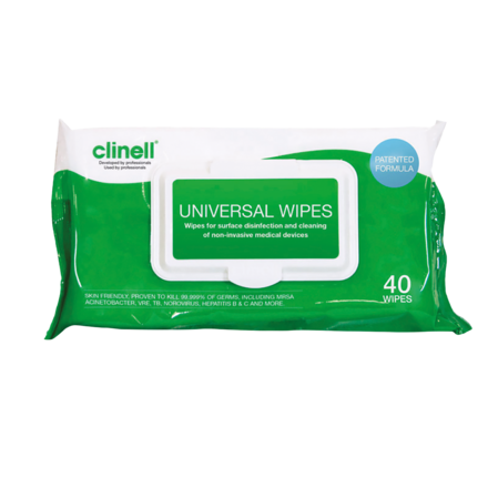 Disinfection wipes for cleaning surfaces and non-invasive medical devices. Contains a patented antimicrobial formula to be used as a skin-friendly disinfectant and detergent wipe, replacing the need for multiple wipes and surface cleaners. Kills 99.999% of germs, effective from 10 seconds.