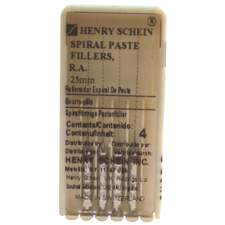 Spirals 25mm length RA. Used to carry root canal cement apically in clockwise rotation after there has been a mechanical preparation of the root for treatment. Colour coded rings for easier identification. Wire is grounded in a conical shape and then formed into spirals with a tapered design. Stainless steel.