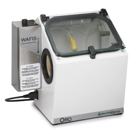 Compact and practical manual devesting sandblaster, ideal for removing investment and casting oxidations with recirculating aggressive corundum.