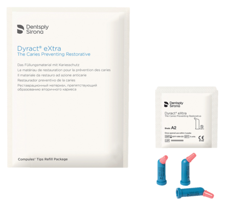 Dyract Extra is a next generation of compomer, specifically designed for restoring all cavity classes in anterior and posterior teeth. Improved handling. 10 second cure at 2mm. Extended working time of 90 seconds. Increased fluoride release rates. Increased surface hardness. Better polishability.