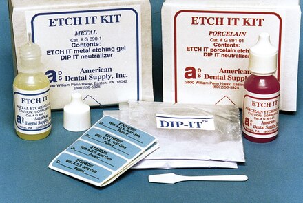 Fast. Convenient. Economical. Spot etching for metal bridge-work, porcelain veneers and tooth enamel. Chemical reaction begins when applied and continues until removed. Rinses easily when complete. Effective on all porcelains. Will not over etch delicate restorations. Will not run or drip over margins.