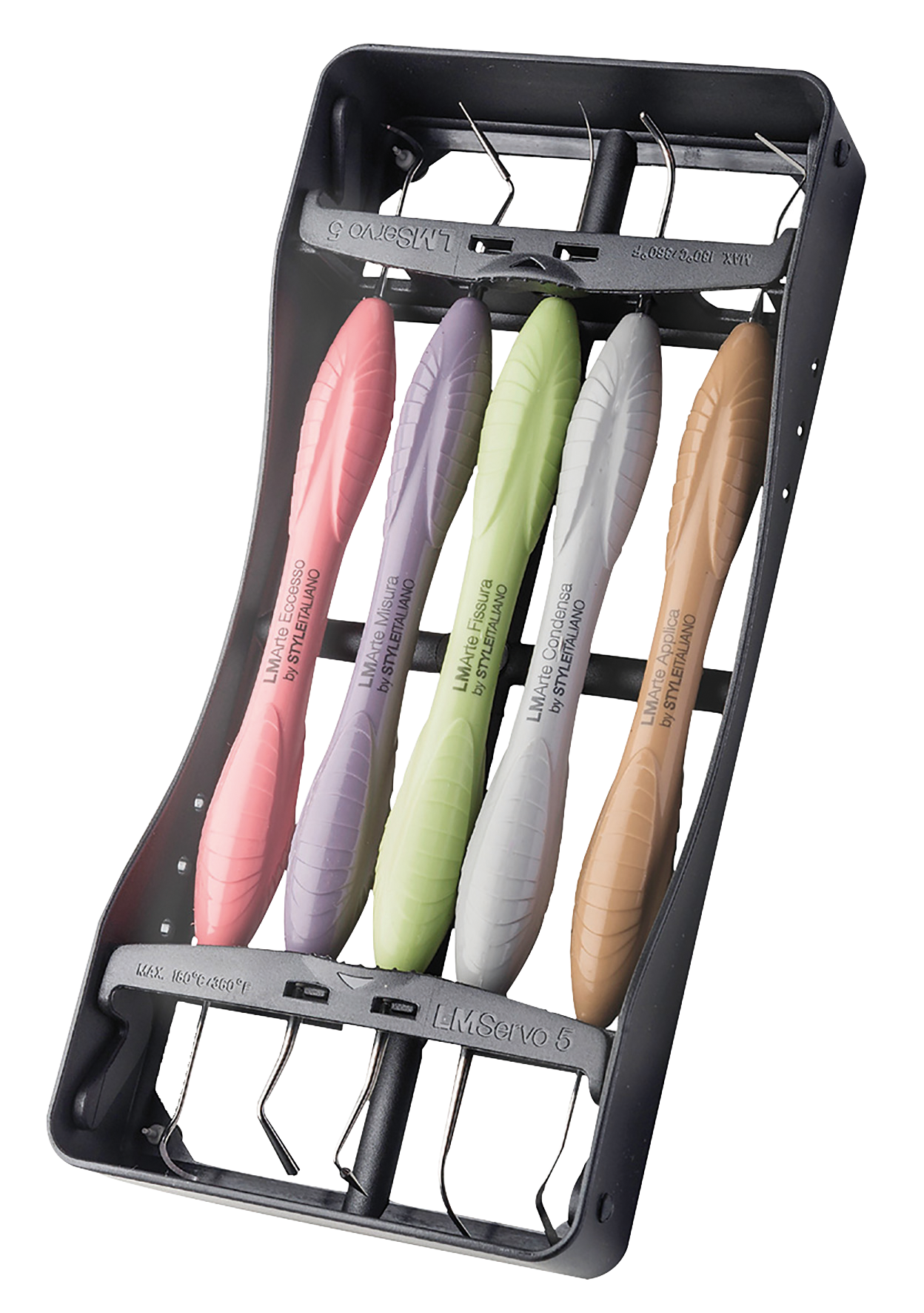 Innovative instruments for aesthetic restorations that have been specially designed for composite layering. Developed in cooperation with Style Italiano - a study group of clinicians and researchers specialising in aesthetic restorative dentistry. Ergonomic handles reduce the risk of repetitive strain injury. Medical-grade silicone ensures superior grip even with a wet glove. Specialist instruments ensure a perfect match for your needs. LM Arte Kit with ErgoSense Handle includes LM Arte Applica, LM Arte Condensa, LM Arte Fissura, LM Arte Misura and LM Arte Eccesso in LM-Servo 5 Cassette.