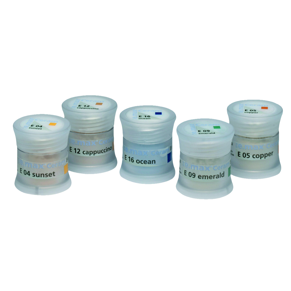 Layering ceramic used for internal characterisations, mixing with other IPS e.max Ceram powders, and for final superficial, external characterisations. The very fine powders demonstrate different degrees of fluorescence depending on the individual shade.