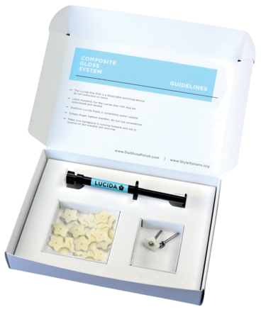 Complete kit including LUCIDA diamond paste, disposable Star Felts and autoclavable latch mandrels. Ideal thickness of the Star Felts allows facial, interproximal and occlusal polishing, even in hard-to-reach areas. Diamond paste is a submicron hybrid water-soluble polishing compound which stays and spreads perfectly while polishing, for a reliable final gloss. Mandrels are autoclavable. Kit includes Diamond Paste 2g, Mandrels x 5, and Felt Wheels x 70.