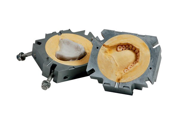 A single flask in which the completed wax set-up can be invested and injected using Palajet.