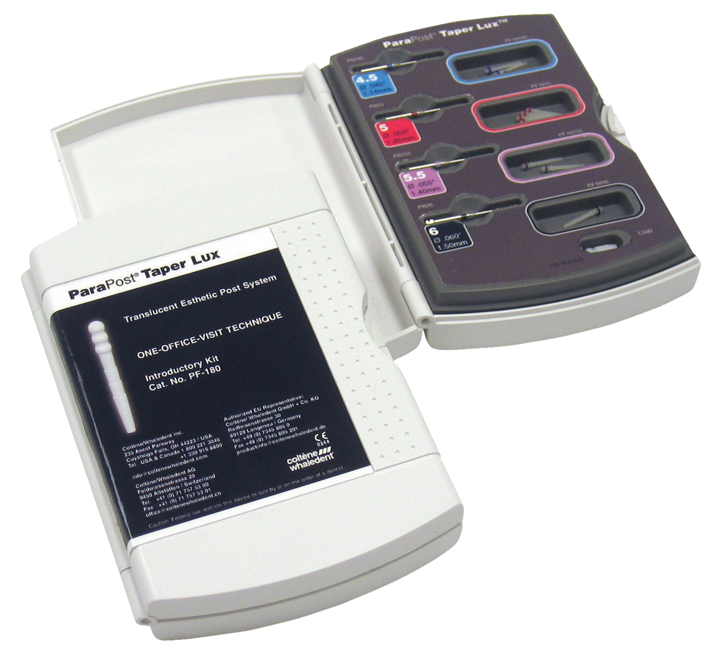 Parallel and tapered translucent fibre post system. An alternative to metal posts when an aesthetic metal-free restoration is desired. Outstanding strength. Rounded head design reduces stress and locks-in composite core material. Radiopaque and removable. Light transmitting for fast cementation. Intro Kit: (PF180) Posts Size 4.5 (1.14mm) x 5, Size 5 (1.25mm) x 5, Size 5.5 (1.40mm) x 3, Size 6 (1.50mm) x 2, Drill x 4 (one of each size) and Hand Driver