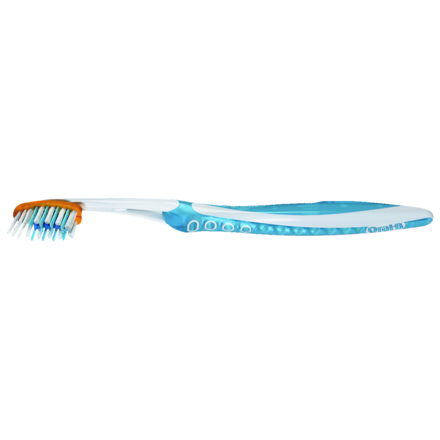 Toothbrush for deep and thorough cleaning of the mouth. Flexible wings adjust to contours of teeth and gums. Better plaque reduction at gingival margin. Removes plaque by up to 94% in interproximal areas. Reduces gum bleeding by up to 26% in 4 weeks.