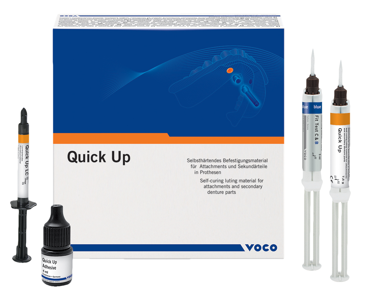 Gingiva-coloured self-curing luting composite used for bonding attachments, such as ball locators and telescopic anchors, as well as other anchors in composite-based dentures. Can also be used for reattaching secondary elements in a denture, such as bar retainers. Direct pick-up results in more accuracy compared to indirect method. Low-heat, self-curing material avoids tissue irritation. High bond strength to acrylic denture base. Allows pick-up of any attachment. Kit includes QuickMix Syringe 7.5g, Quick Up LC Syringe 2g, Adhesive 4ml, QuickMix Syringe Fit Test C & B 5ml, and Accessories.