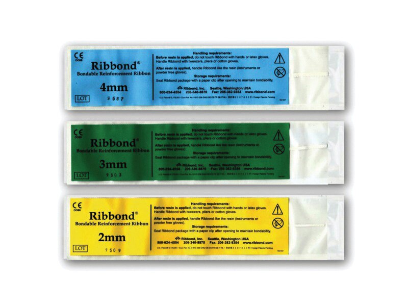 Bondable reinforcement ribbon which prevents fracture failures in dental composites and acrylics. High-strength fibres, enhanced bondability, and cross-link lock-stitch leno weave for toughness. Disappears with composite or acrylic without show-through. Excellent aesthetics. Translucency allows the use of light-cured composites. Use the specially designed Ribbond scissors to cut through the fracture-tough fibres with ease. It is important that there are zero stray uncut fibres as these fibres can 'float' in the composite and become a nuisance to the patient. Thickness: Original 0.35mm; THM 0.18mm.