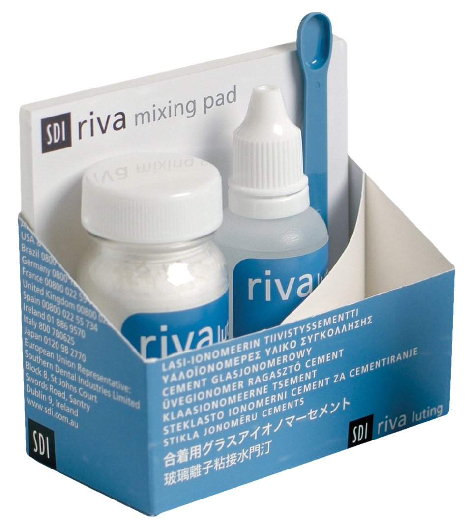 Self curing glass ionomer luting cement, designed for final cementation of metal based restorations. Indications include cementation of metal or porcelain fused to metal inlays, onlays, crowns, stainless steel crowns, posts and screws, as an attachment of metal orthodontic bands, or as a base or liner. High fluoride release to assist with remineralisation of the natural dentition. Low solubility in the oral environment, increasing the materials ability to resist disintegration and wear caused by oral acidity. High flexural strength enhances longevity. Kit: Powder 35g, Liquid 24ml, Plastic Scoop and Mixing Pad