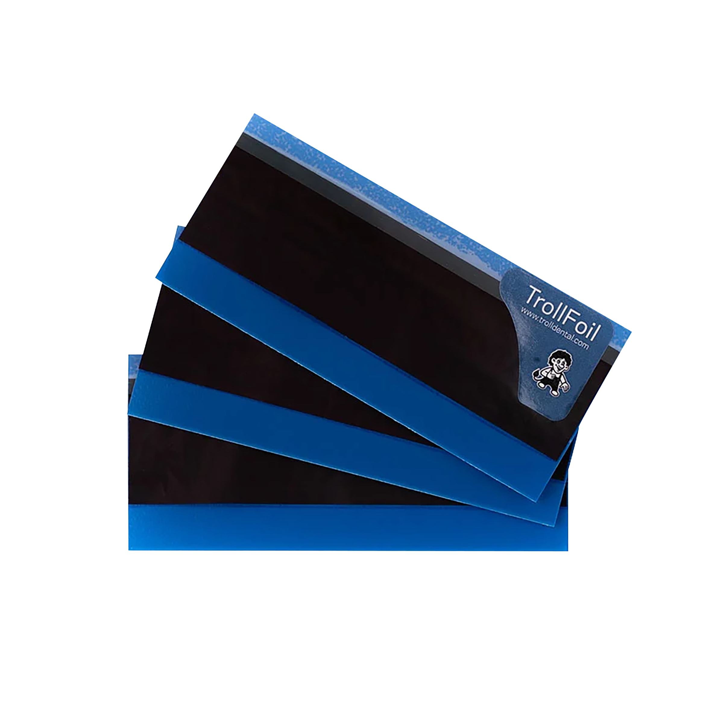 Articulating foil for use in a wide variety of clinical situations, including wet or dry teeth, limited opening, limited vestibular space, gaggers, and metal and non-metallic restorations. Allows the user to verify occlusal contacts for both arches from one tooth to an entire quadrant, using the mini or the original quadrant size. Double-sided foil is only 8 microns thick and is able to mark wet surfaces, dry surfaces or highly polished surfaces, such as cast gold or porcelain. Mounted in its own frame: no forceps needed.