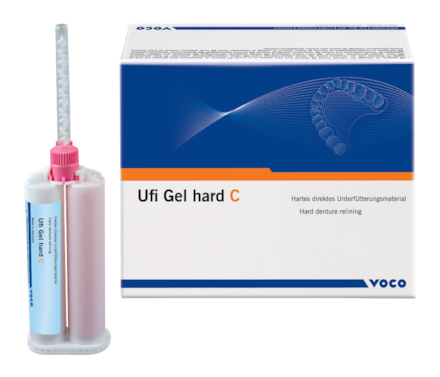 Hard, cold polymerising relining material for the rebasing of partial and fully removable dentures. Application from the safety cartridge ensures homogeneous, bubble-free mixing. Only 6 minutes in the mouth with no noticeable heat development. Odourless and taste-free.